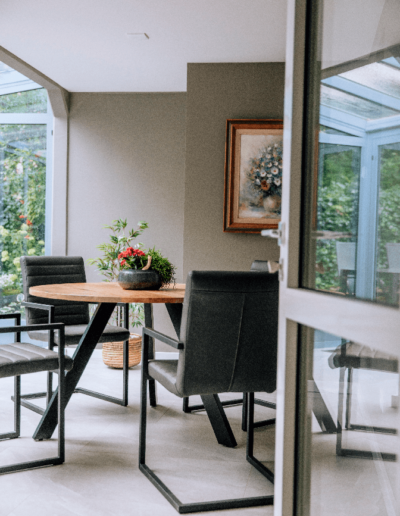 “Marianne is in staat geweest om buiten en binnen perfect op elkaar aan te laten sluiten. Zo is de serre echt een verlengstuk van de tuin rondom geworden, of net andersom. Het is maar zoals je het wilt zien. In ieder geval ben ik heel blij dat ik de stap heb genomen want Marianne heeft heel goed aangevoeld wat bij mij past en kon mij daarin overtuigen met sterke argumenten. Er is nu veel rust in huis en ik geniet ook van alle positieve reacties die ik krijg. Ik kan het iedereen aanraden,” aldus een enthousiaste meneer Voncken, opa van drie prachtige kleinkinderen en een vierde op komst. “Mijn vertrouwen is beloond, en meer nog dan dat. Mijn thuis is een gastvrij huis waar kinderen, kleinkinderen, vrienden en familie graag komen. Daarvoor ben ik graag uit mijn comfortzone gestapt”.